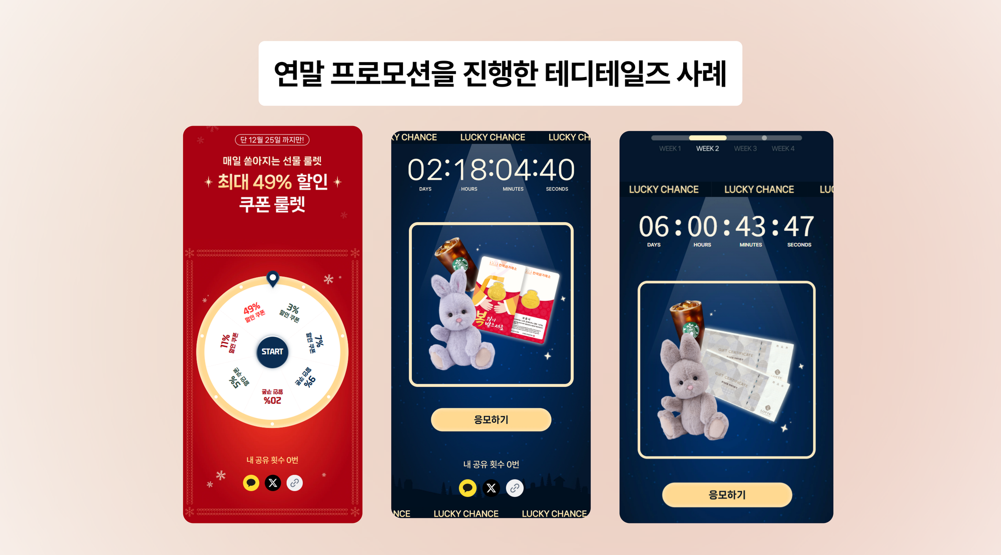 테디테일즈는 한 달 동안 즉석 당첨형 이벤트와 주차별 응모형 이벤트를 병행하며 고객들에게 지속적인 재미를 제공했습니다. 매일 참여할 수 있는 즉석 당첨 이벤트로 자사몰 방문을 습관화시키고, 주차별로 바뀌는 응모형 이벤트로 새로운 기대감을 불러일으켰죠. 이러한 구조는 신규 고객 전환부터 기존 고객의 인게이지먼트까지 한 번에 관리할 수 있게 해주었습니다. 특히 연말 시즌이라는 마케팅 대목과 맞물려 이벤트 참여율은 물론 실제 구매 전환까지 확실한 성과를 낼 수 있었어요.