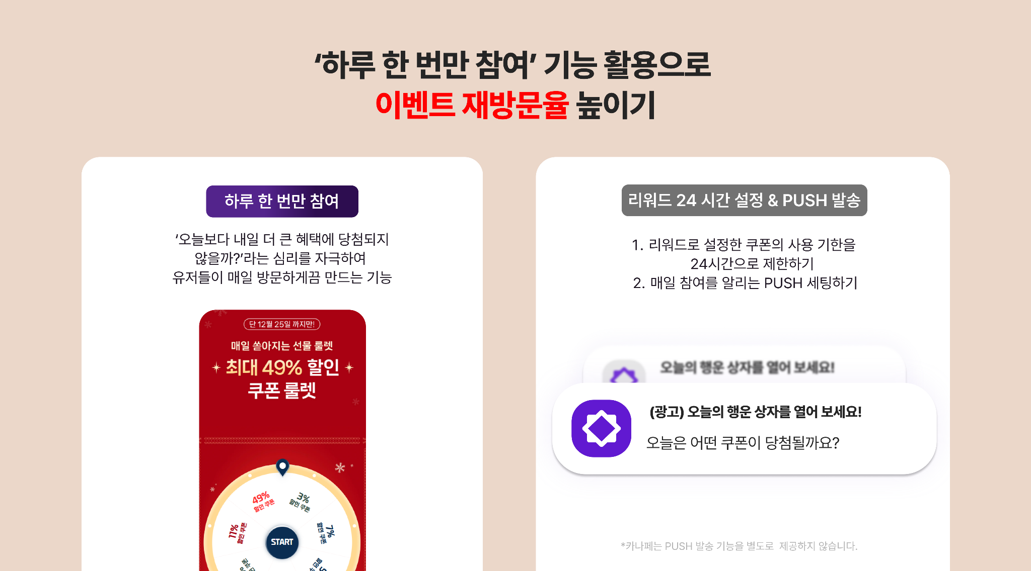 기능 요약: 이벤트에 이미 참여한 고객이더라도 재참여를 적극 유도하는 장치가 있어야 합니다. 카나페에는 이 포인트를 정확히 반영한 ‘하루 한 번만 참여’라는 기능이 있습니다. 고객으로 하여금 “내일 들어가면 더 좋은 혜택을 받을 수 있지 않을까?” 하는 기대감을 유도하는 기능입니다. 해당 기능 사용 후 이벤트 리워드 사용 기간을 24시간으로 제한하고, '오늘도 또 룰렛 돌려보세요'와 같은 가벼운 푸시 메시지를 매일 세팅해 두면 고객 심리를 자극해서 반복적인 이벤트 참여를 유도할 수 있습니다.